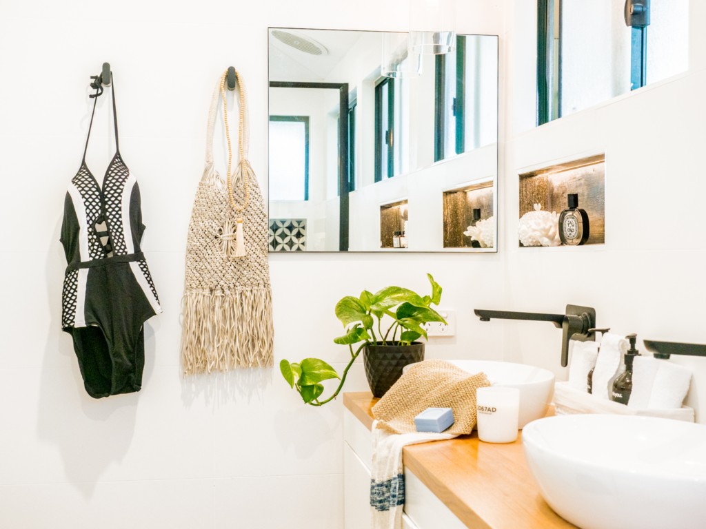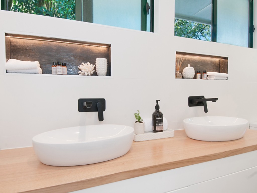 The beautiful brand new bathroom features double basins, rain shower and smart black tapware.