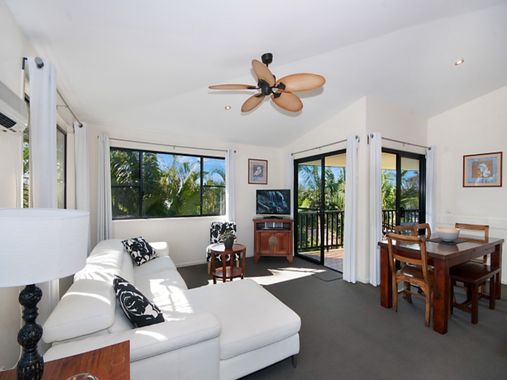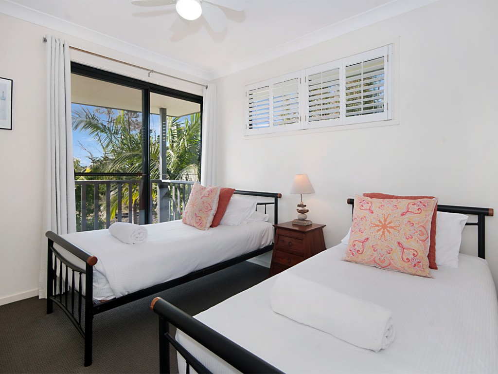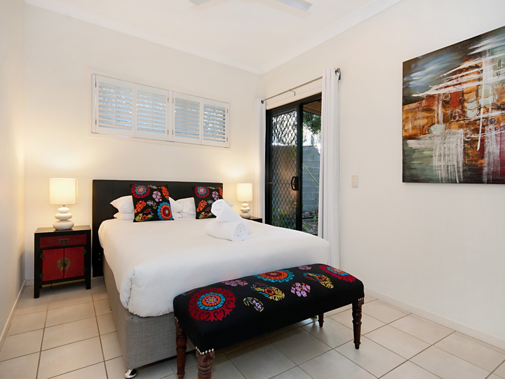 There are three bedrooms in total, each with a balcony or patio. Two are located upstairs, one queen, and the other has two single beds. A full bathroom with a bath and separate shower as well as a powder room are located adjacent the bedrooms. The queen bedroom has its own deck complete with balinese day bed perfect for unwinding with a good book.