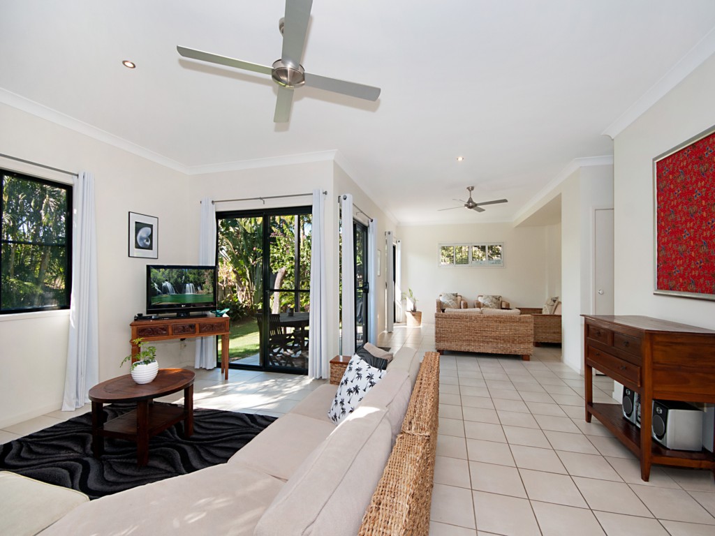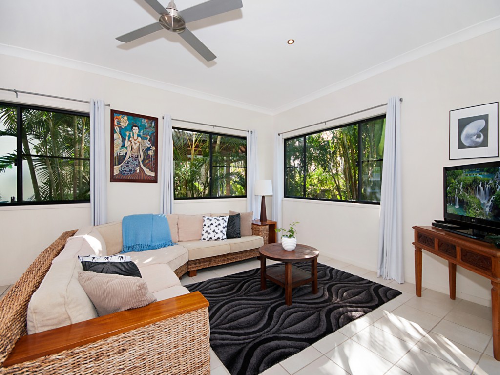 The main bedroom suite is located downstairs, and has a three way bathroom ensuite featuring a shower room! The ground floor has a large spacious living room which opens onto a covered balcony and is a lovely place to sit and enjoy the tropical gardens.