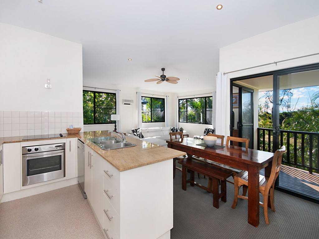 The kitchen forms part of the upstairs living and dining space, is extreamly well equiped for entertaining and features stainless steel appliances, dishwasher, microwave and granite benchtops. Should you feel like relaxed dining there is a BBQ on the downstairs veranda.