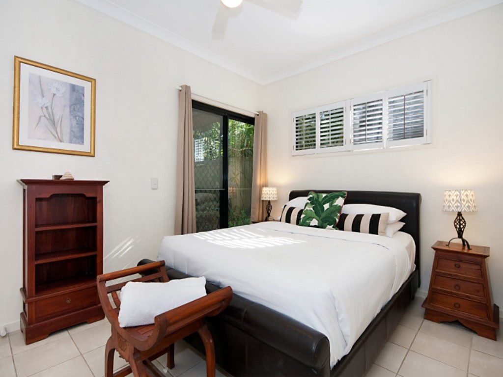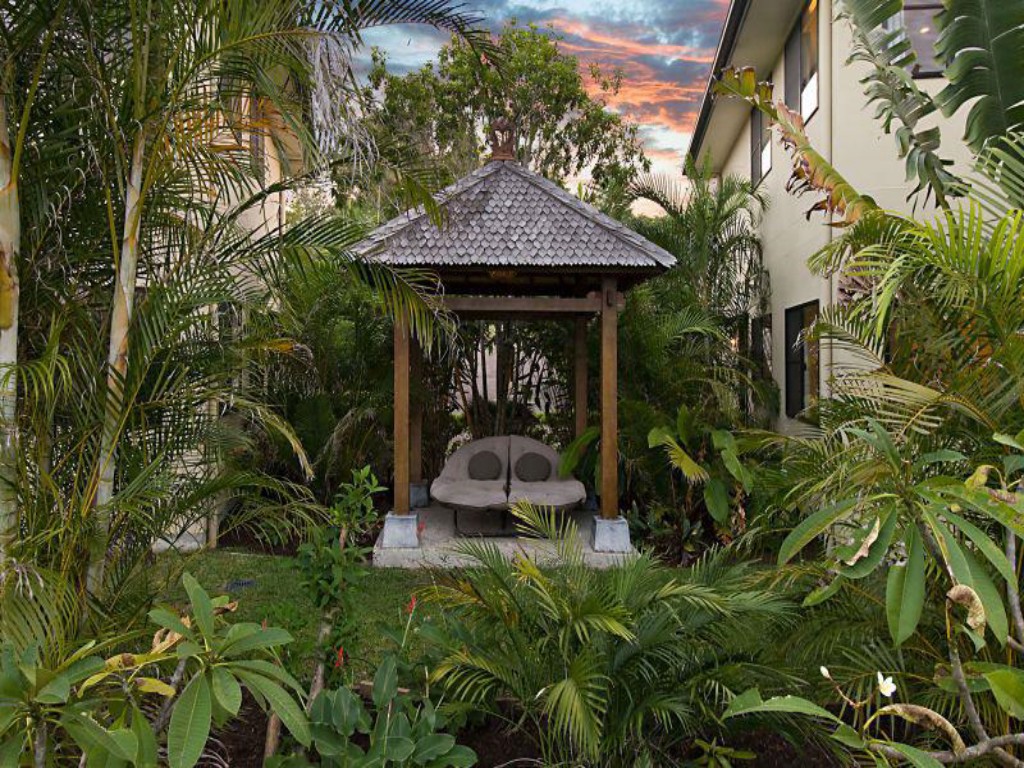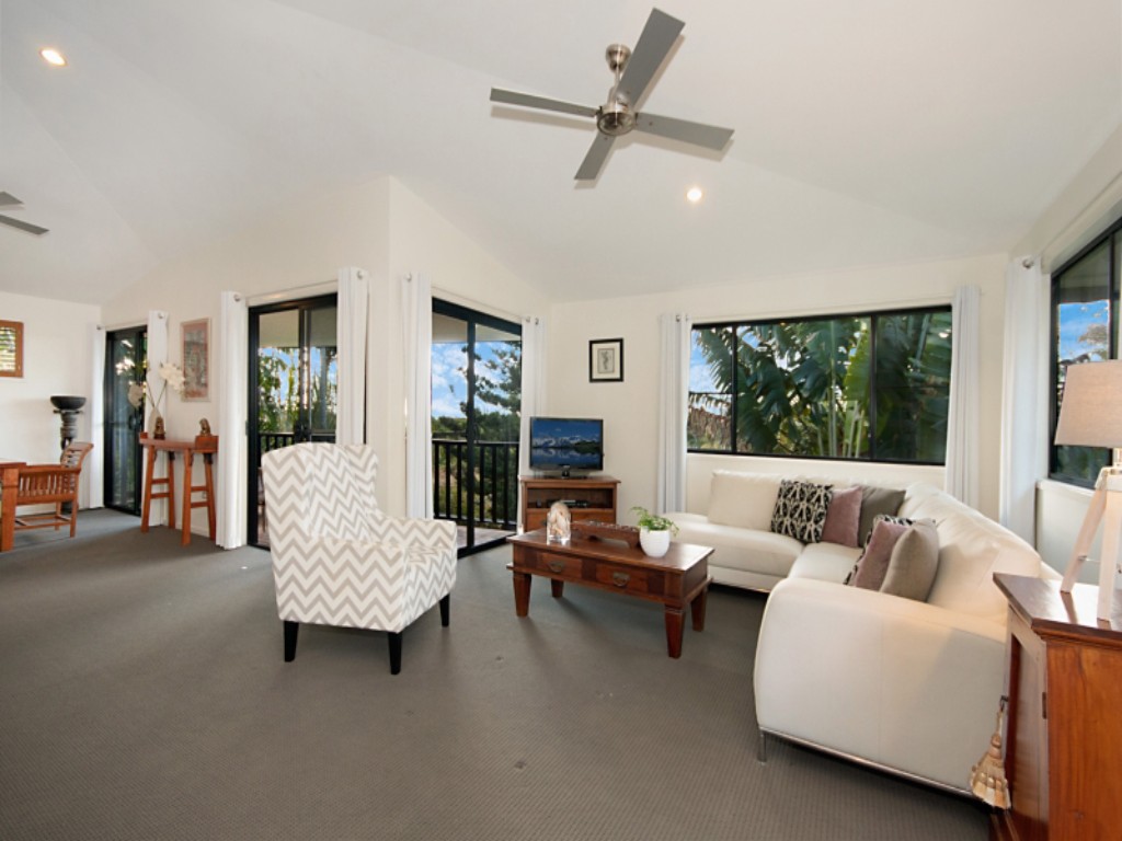 There are three bedrooms in total, each with a balcony or patio. Two are located downstairs, one queen, and the other has two single beds. A full bathroom with a bath and separate shower as well as a powder room are located adjacent the bedrooms. The main bedroom suite is located upstairs and has its own deck complete with balinese day bed perfect for unwinding with a good book. The three way bathroom ensuite featuring a shower room!