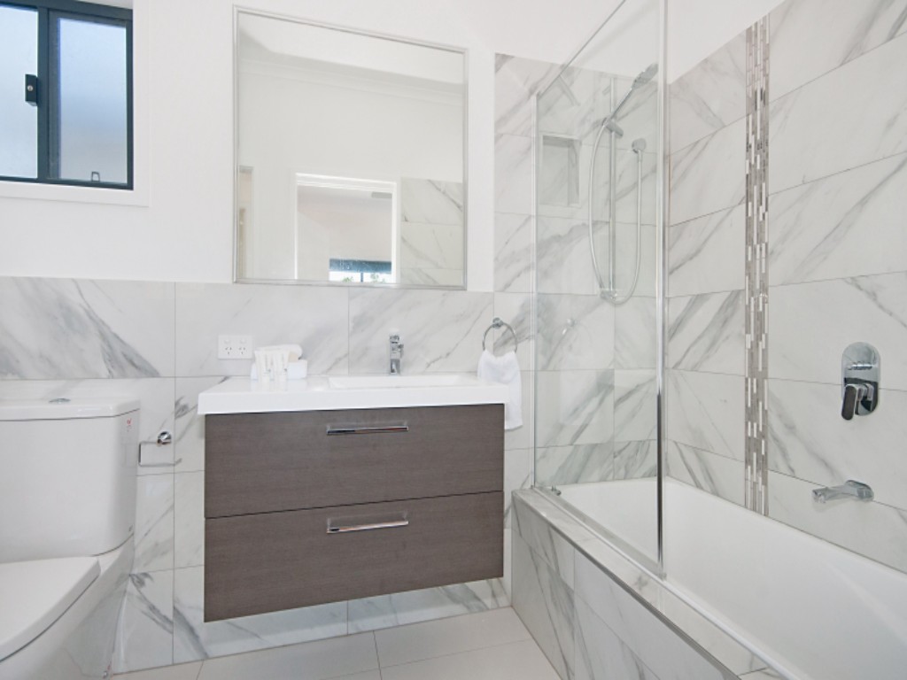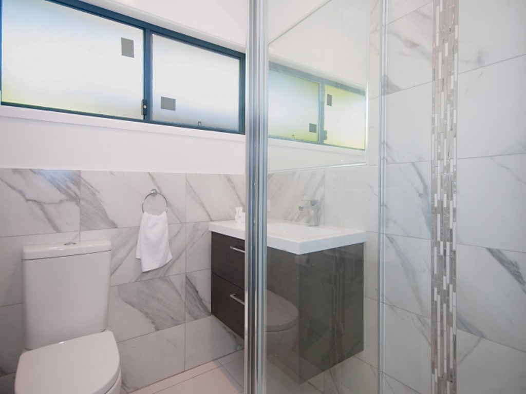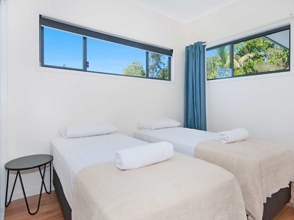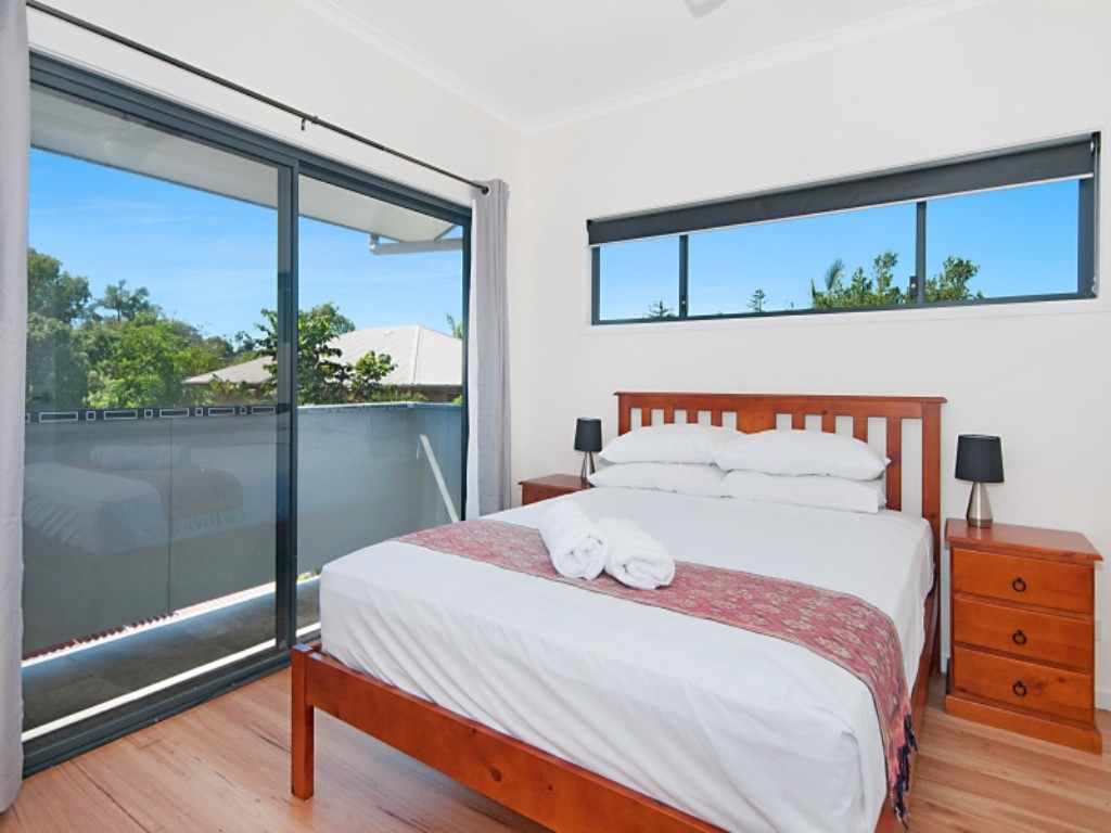 Accessed via a light filled timber staircase are a further two bedrooms. The master has a queen sized bed balcony and walk in wardrobe. The third bedroom has 2 king single beds which can come together to form a king sized bed on request. A full bathroom including bath tub is located on this level.