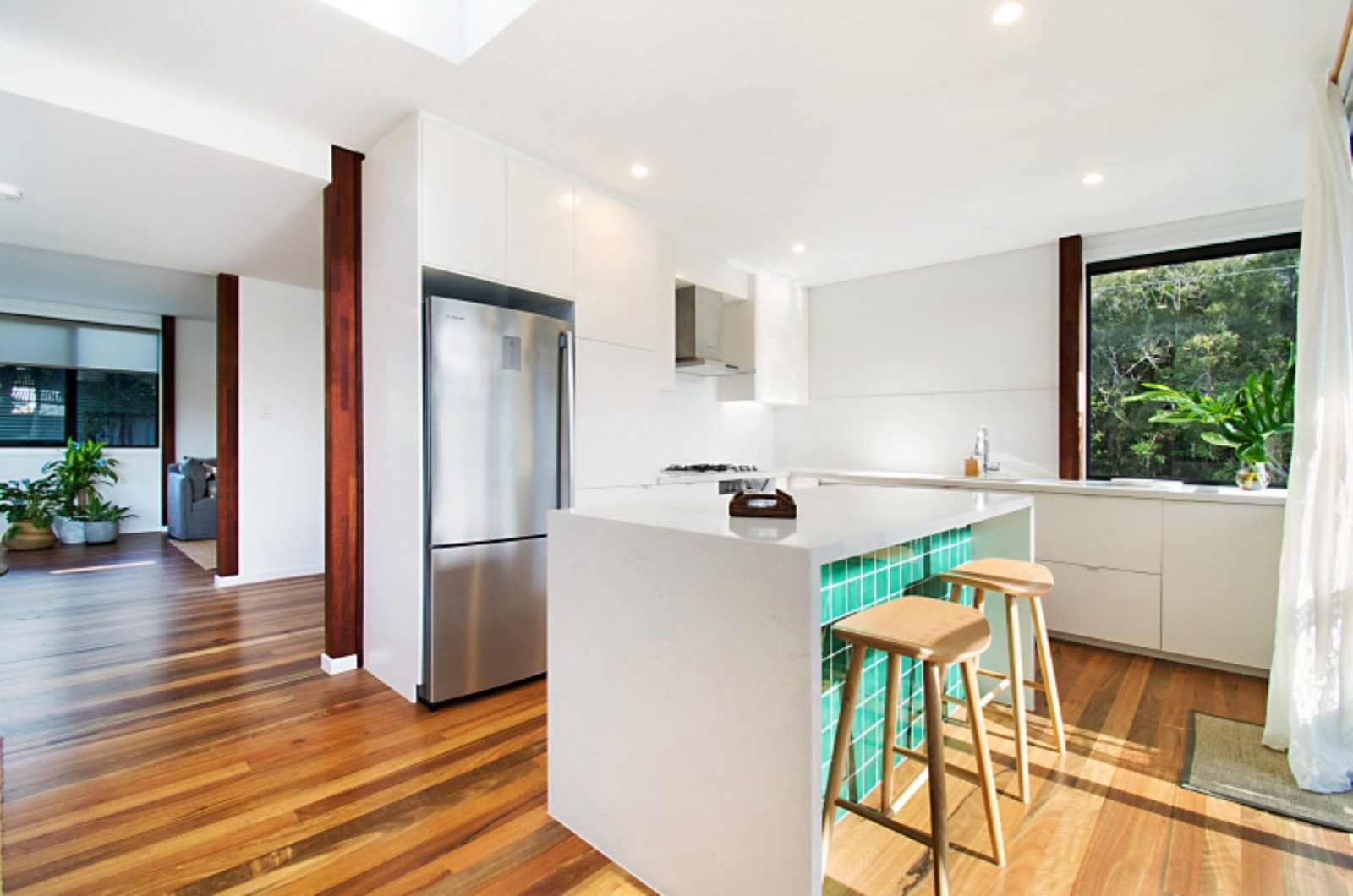 The house is set over three stories the ground floor has a terrific undercover area and there is a large laundry with ample area for storing surfboards and your beach equipment. The first floor is your living room and is accessed via a beautiful timber stair case. The living room is open plan and spacious with two decks. Complimentary Wi-Fi and Neflix are supplied for your entertainment. The main deck is off the well equipped contemporary kitchen and is your BBQ area, a great place for alfresco dining on your gas Webber BBQ.